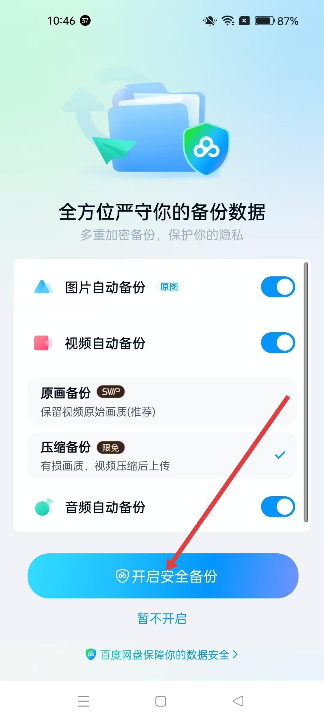 4、登錄后,可選擇開(kāi)啟安全備份功能,享受圖片、視頻、音頻等自動(dòng)備份服務(wù)。