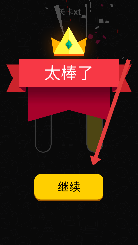 2、成功完成關(guān)卡1后界面彈出帶有皇冠裝飾,顯示太棒了的提示,點(diǎn)擊下方繼續(xù)按鈕,進(jìn)入下一個(gè)更具挑戰(zhàn)的關(guān)卡。