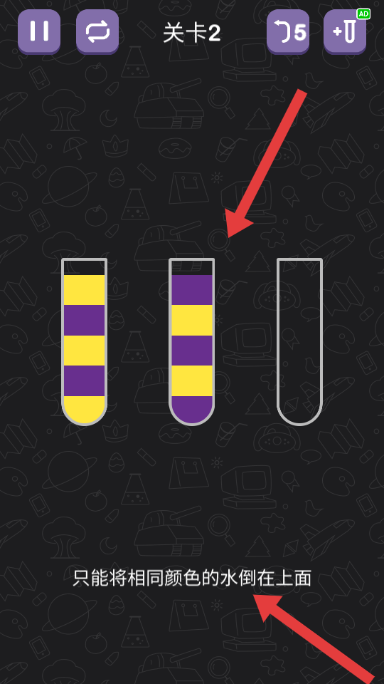 3、到關(guān)卡2依據(jù)只能將相同顏色的水倒在上面規(guī)則,操作試管把相同顏色液體倒入對應(yīng)試管完成解謎。