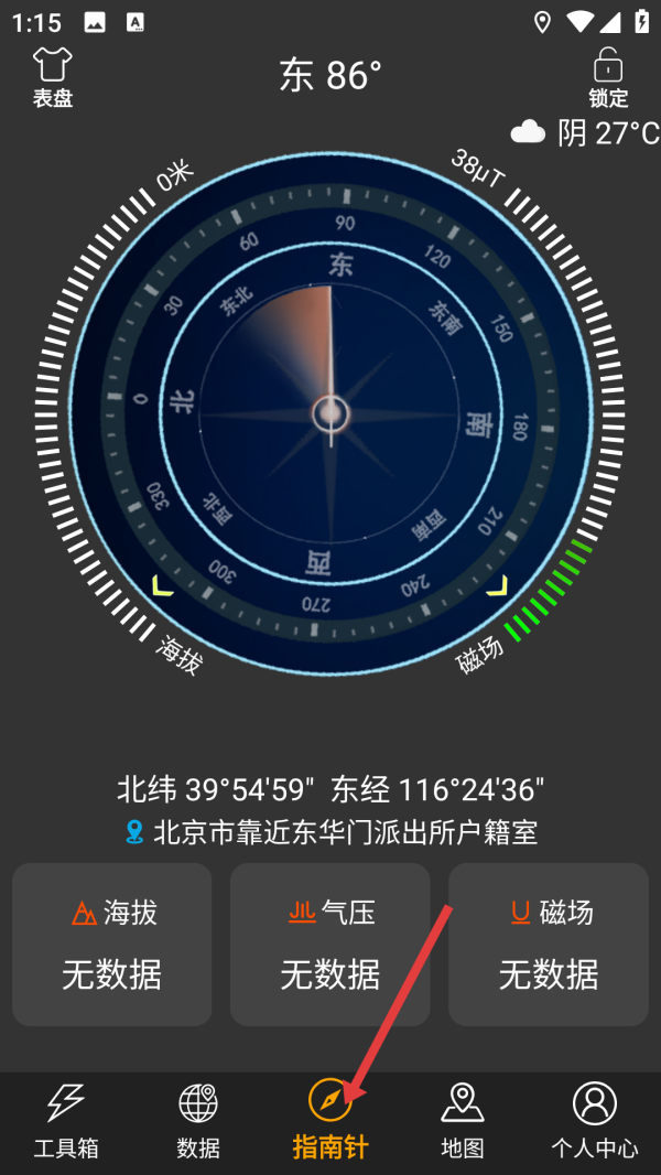 2、指南針模塊界面呈現(xiàn)精準(zhǔn)羅盤(pán),實(shí)時(shí)顯示方位、海拔、氣壓等數(shù)據(jù),清晰標(biāo)注經(jīng)緯度與所處位置,轉(zhuǎn)動(dòng)設(shè)備,羅盤(pán)指針同步轉(zhuǎn)動(dòng),幫你快速辨別方向。