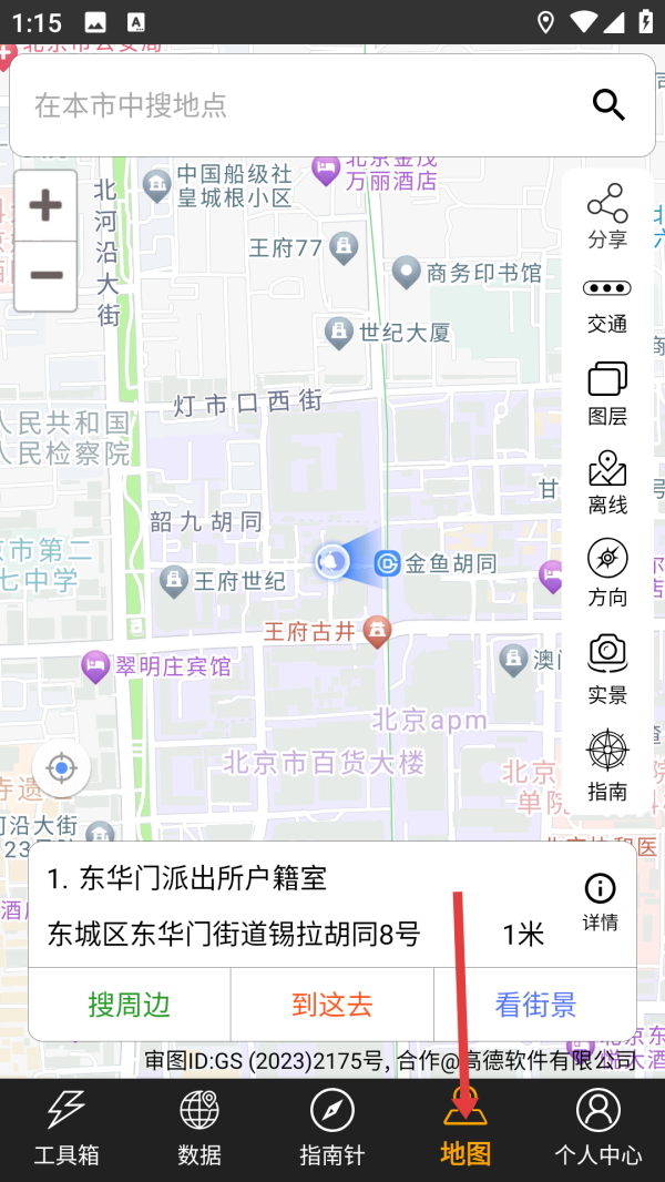 3、點(diǎn)擊地圖進(jìn)入地圖頁(yè)面,可搜索地點(diǎn)查看周邊建筑、道路,定位后能獲取目標(biāo)位置詳情,結(jié)合指南針功能戶外找路、了解地理環(huán)境更便捷,讓出行與探索更高效。