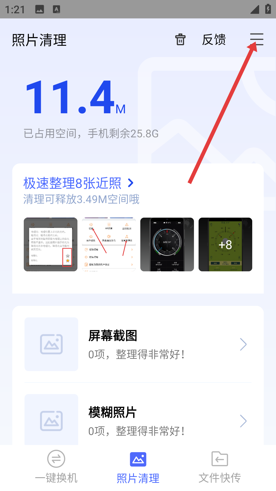 1、打開騰訊換機(jī)助手進(jìn)入照片清理界面,點擊右上角三條橫線圖標(biāo),進(jìn)入更多功能頁面,這里匯聚應(yīng)用各類設(shè)置入口,是調(diào)整廣告推送等隱私相關(guān)配置的第一步。