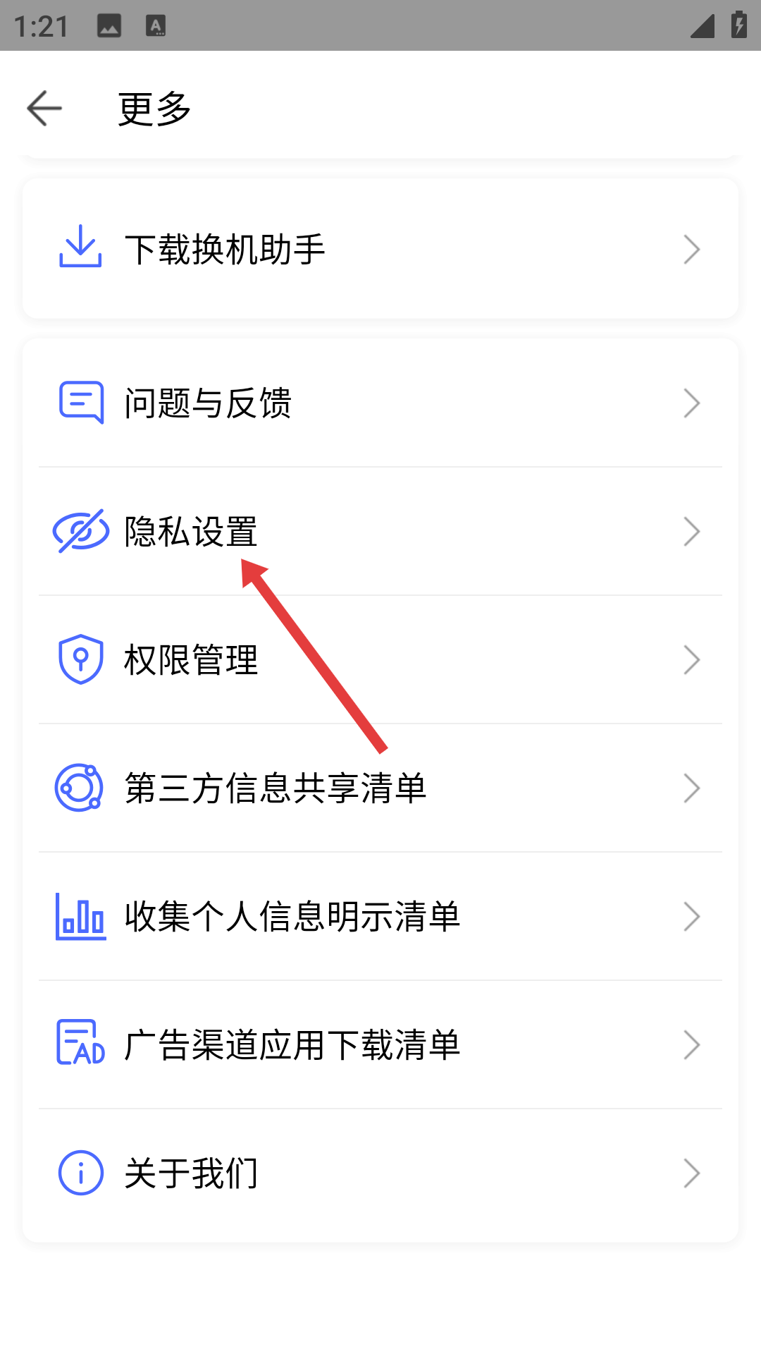 2、在更多功能頁面找到隱私設(shè)置選項并點擊,進(jìn)入隱私配置中心,該界面集中管理個人信息、廣告推薦等隱私相關(guān)內(nèi)容,為精準(zhǔn)調(diào)整廣告推送提供操作路徑。