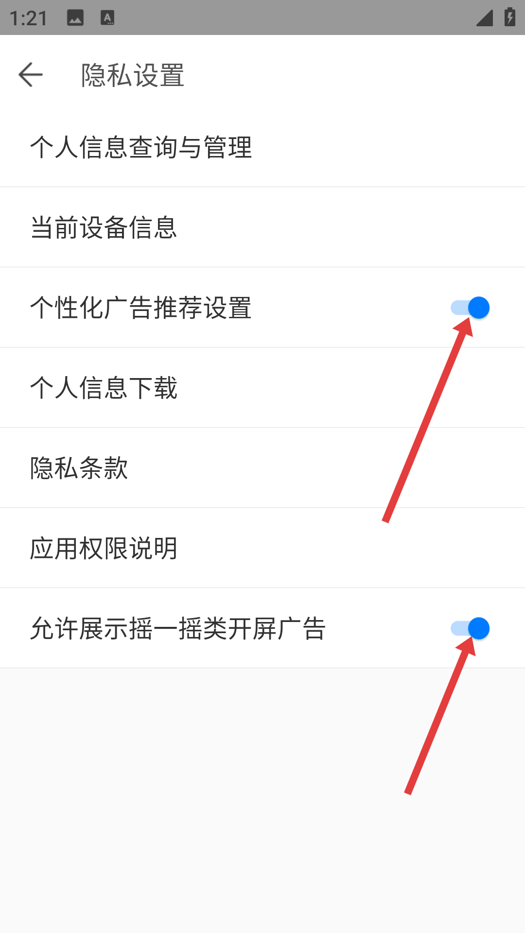 3、進(jìn)入隱私設(shè)置后能看到個性化廣告推薦設(shè)置、允許展示搖一搖類開屏廣告等選項,若想開啟或關(guān)閉對應(yīng)廣告推送,點擊右側(cè)開關(guān)按鈕即可,按需調(diào)整廣告展示模式。