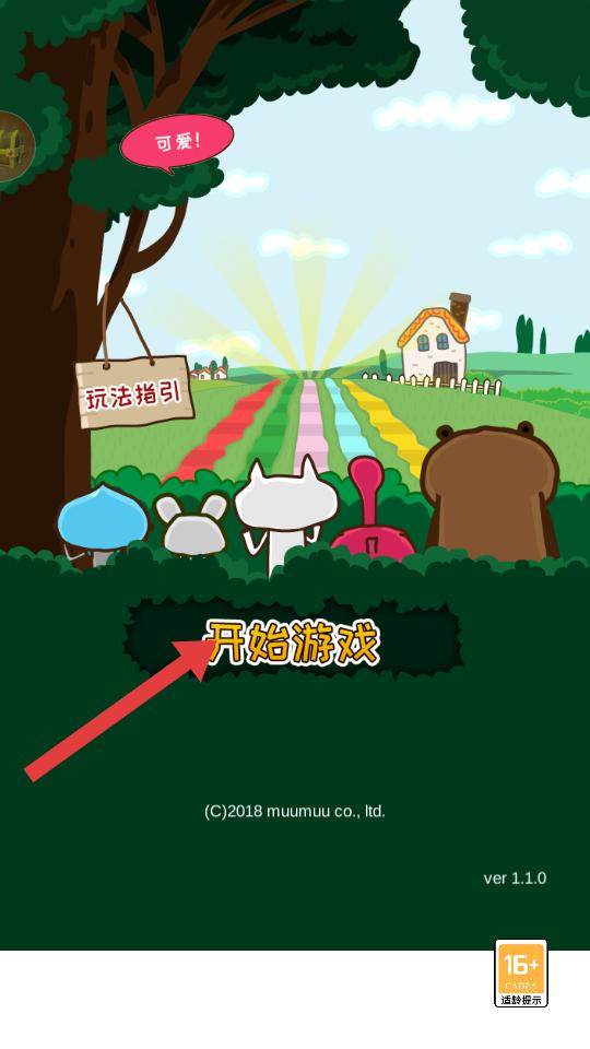 1、進(jìn)入游戲,看到有玩法指引和可愛角色的界面,點擊開始游戲,開啟游戲之旅。