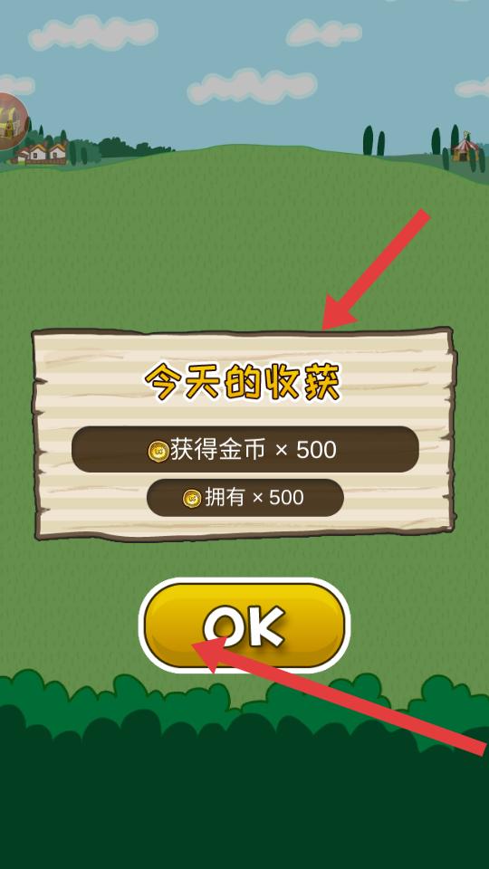 2、游戲中會有今天的收獲提示,顯示獲得金幣數(shù)量,點擊OK,確認(rèn)收獲繼續(xù)游戲。