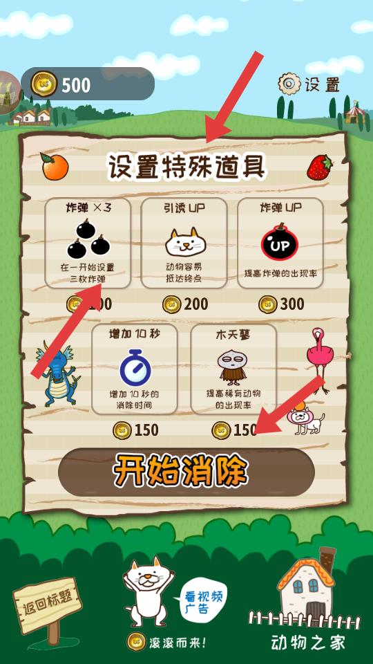3、可進(jìn)入設(shè)置特殊道具界面,用金幣購買炸彈,引誘UP等道具,選好后點擊開始消除。