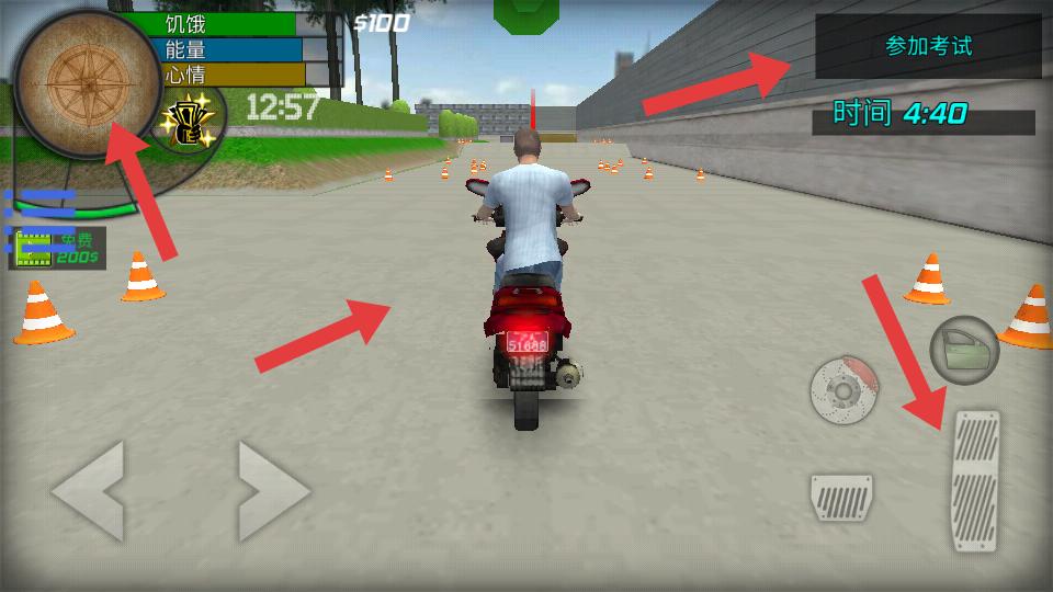 3、參加考試時(shí),會(huì)進(jìn)入有路障的場(chǎng)地,操控摩托車(chē),利用屏幕上的操作按鈕,在規(guī)定時(shí)間內(nèi)完成考試。
