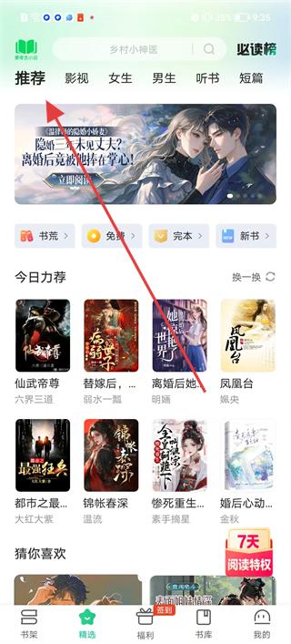 3、進(jìn)入推薦板塊可瀏覽熱門推薦的小說,如隱婚一天不見又夫的言情小說,查看今日力薦和猜你喜歡的小說,選擇心儀的小說閱讀。