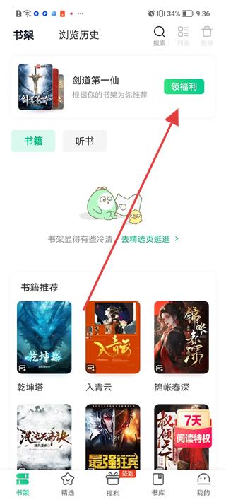 2、進(jìn)入書架板塊可查看推薦的小說如劍道第一仙,點(diǎn)擊領(lǐng)福利按鈕,領(lǐng)取小說福利,也可查看書籍推薦,選擇感興趣的小說添加到書架。