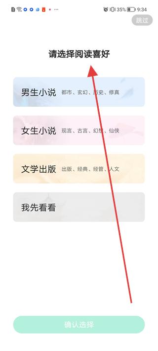 1、打開愛奇藝小說app,進(jìn)入閱讀喜好選擇頁面,可選擇男生小說、女生小說、文學(xué)出版等閱讀喜好,也可選擇我先看看,點(diǎn)擊確認(rèn)選擇按鈕。