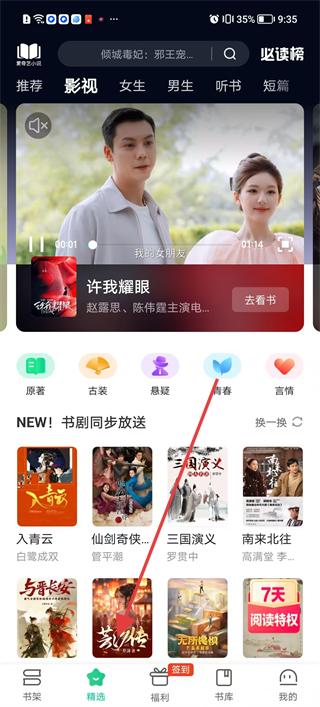 2、進(jìn)入這個(gè)界面后,跟隨箭頭的指引,將視線移到上方,點(diǎn)擊女生小說,跳轉(zhuǎn)到下一個(gè)界面。