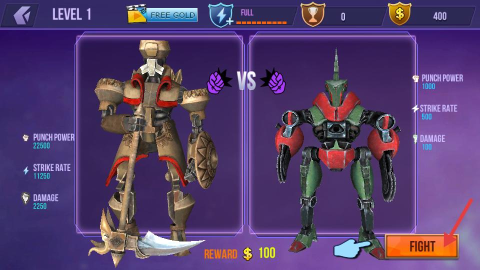 3、玩家進(jìn)入戰(zhàn)斗前,會(huì)展示雙方機(jī)器人的拳力、攻擊速度和傷害等屬性,可據(jù)此判斷勝算,準(zhǔn)備充分后點(diǎn)擊戰(zhàn)斗。