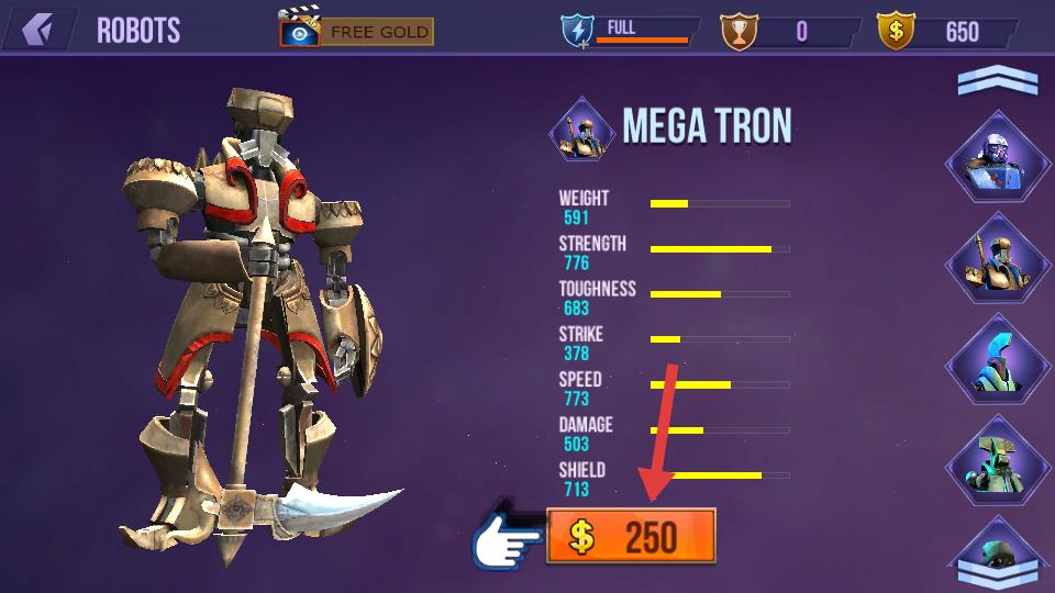 1、開戰(zhàn)前期可以花費(fèi)金幣解鎖如名為MEGA TRON的機(jī)器人,它力量、速度和護(hù)盾屬性出色,能為玩家戰(zhàn)斗助力。