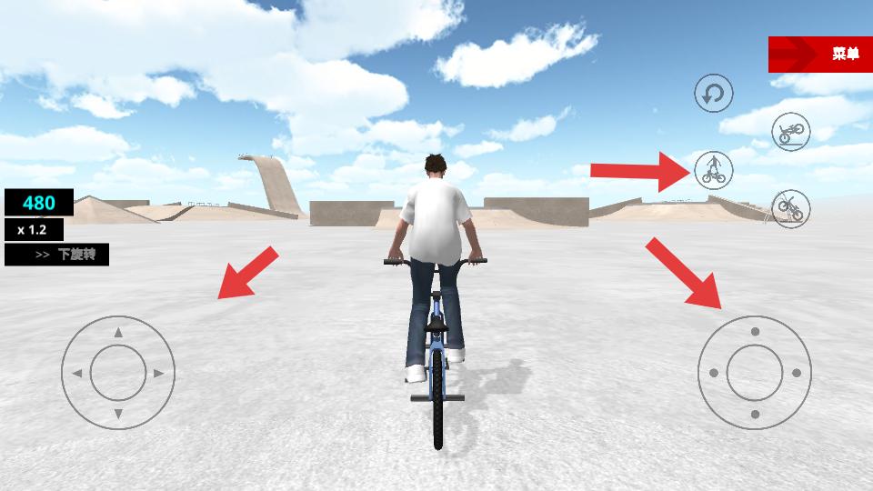 4、進(jìn)入游戲場景,利用屏幕上的操作按鈕,控制自行車移動,做出特技動作,在賽道上盡情騎行。