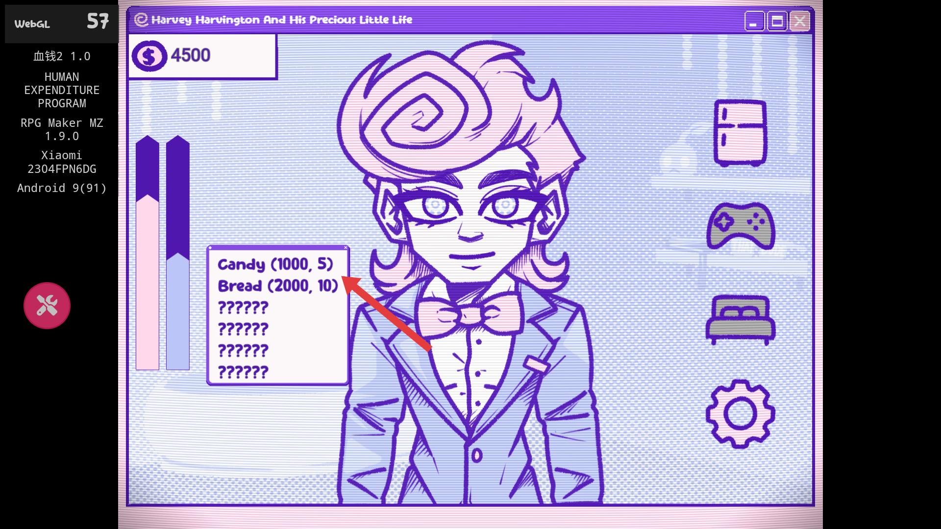 3、點(diǎn)擊冰箱圖標(biāo)后,會(huì)出現(xiàn)物品列表,像Candy、Bread等,可根據(jù)需求選擇物品,消耗相應(yīng)金錢(qián)獲取,以滿足游戲中的各類(lèi)需求。