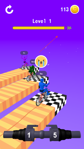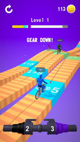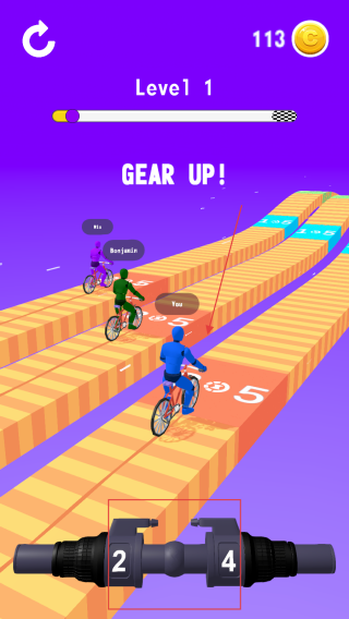 1、游戲界面下方有標(biāo)有數(shù)字的齒輪裝置,根據(jù)賽道情況和提示,點擊對應(yīng)的數(shù)字來切換齒輪,調(diào)整單車的速度。