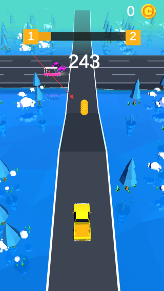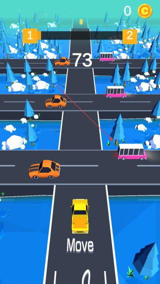 2、在前進(jìn)過(guò)程中公路上會(huì)出現(xiàn)如橙色轎車、粉色巴士等其他行駛的車輛通過(guò),移動(dòng)手指改變汽車在公路上的位置,躲避這些車輛。