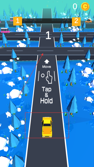 1、進(jìn)入游戲后根據(jù)提示圖標(biāo)標(biāo)記的點(diǎn)擊,并按住屏幕來(lái)操控汽車在公路上前進(jìn),松開(kāi)手指汽車則會(huì)停止移動(dòng)。