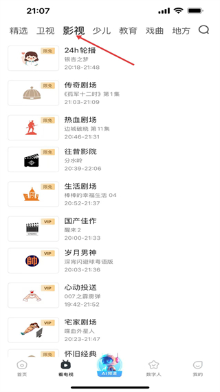 1、影視板塊有24h輪播、傳奇劇場(chǎng)等欄目,涵蓋孤軍十二時(shí)等影視內(nèi)容,分限免和VIP板塊,可觀看各類劇場(chǎng)影視。