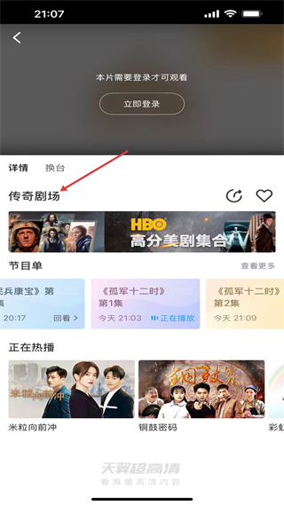 2、傳奇劇場(chǎng)頁(yè)需登錄觀看,節(jié)目單有孤軍十二時(shí)等劇集,正在熱播米粒向前沖、銅鼓密碼等影視內(nèi)容。