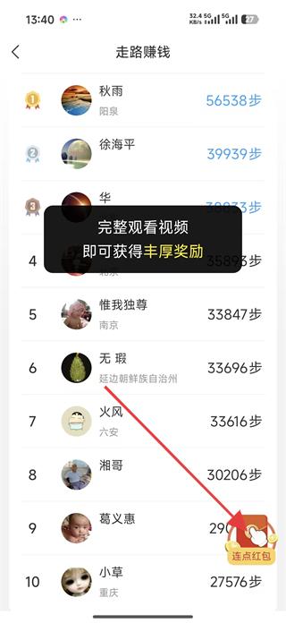 4、點(diǎn)擊選點(diǎn)紅包按鈕完整觀看視頻即可獲得豐厚獎勵,同時可參與步數(shù)排名,獲取賺錢獎勵,享受運(yùn)動賺錢的樂趣。