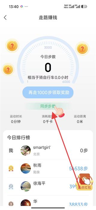 2、在走路賺錢頁面點(diǎn)擊同步步數(shù)按鈕,可同步當(dāng)日步數(shù),查看相當(dāng)于騎自行車的時長,了解運(yùn)動消耗情況。