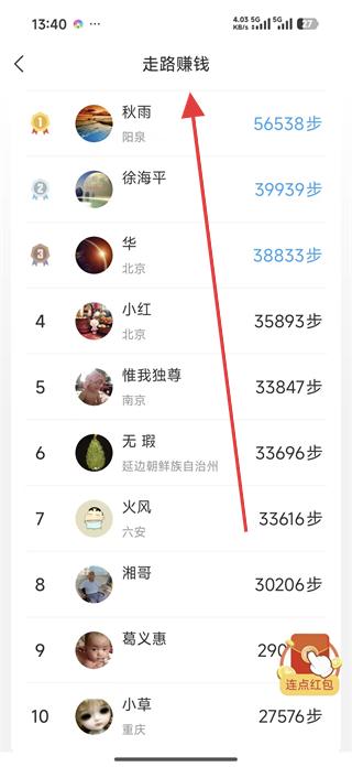 3、在今日排行榜中可查看自己和其他用戶的步數(shù)排名,如秋雨、徐海平等用戶的步數(shù)情況,了解運(yùn)動排名。