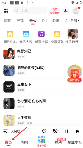 1、首頁板塊在最火分類下,推薦紅顏知己等熱門歌曲,設(shè)福利中心等功能入口,滿足用戶音樂收聽與福利領(lǐng)取需求,界面實用便捷。