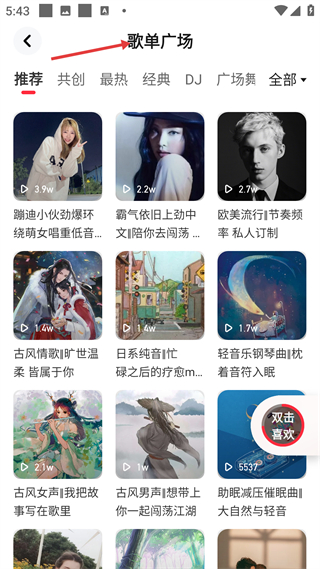 2、歌單廣場板塊有推薦、共創(chuàng)等分類,涵蓋蹦迪、古風等多樣歌單,為用戶提供豐富音樂選擇,滿足不同音樂風格喜好。