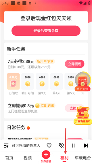 3、福利板塊可登錄領(lǐng)現(xiàn)金紅包,有新手任務(wù)和日常任務(wù),助力用戶邊聽音樂邊賺收益,提升使用動力。