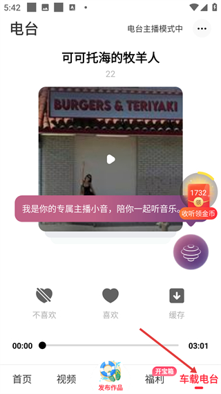 4、車載電臺板塊播放可可托海的牧羊人,有專屬主播陪伴,支持點贊、緩存等操作,為駕車用戶打造專屬音樂收聽場景。