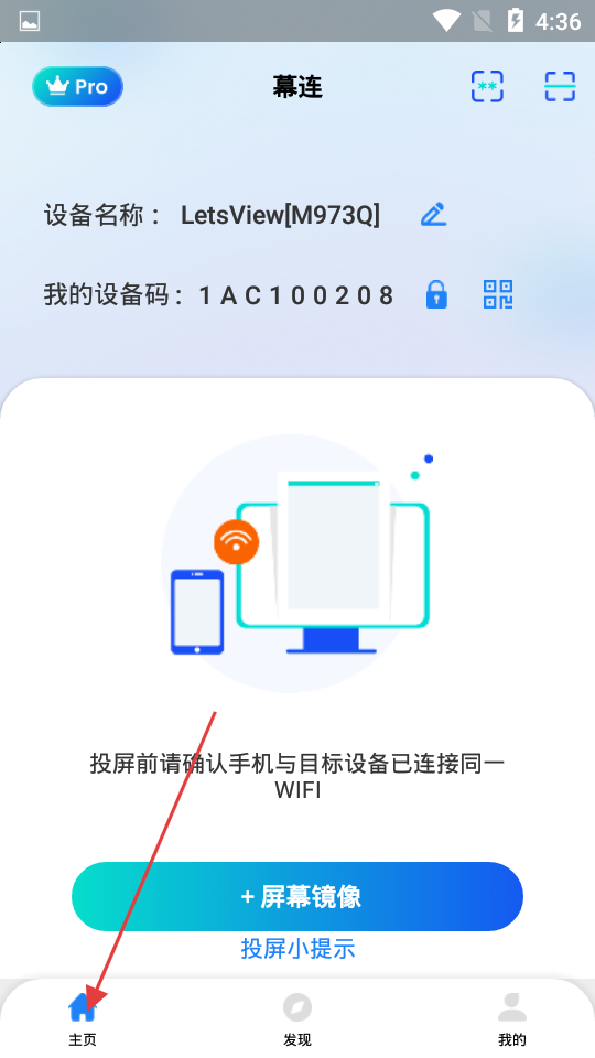 1、幕連應用主頁清晰展示設備名稱與設備碼,方便用戶快速知曉自身設備信息,點擊加屏幕鏡像按鈕,即可開啟投屏流程,操作直觀快速進入投屏環(huán)節(jié)。
