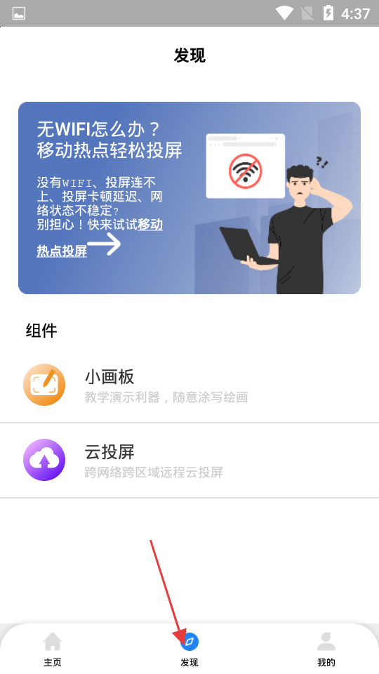 2、發(fā)現(xiàn)頁為無傳統(tǒng)WIFI環(huán)境下的投屏提供解決方案,小畫板可用于教學演示時涂寫繪畫,云投屏支持跨網(wǎng)絡跨區(qū)域遠程投屏,滿足遠程協(xié)作等需求,豐富了投屏功能。