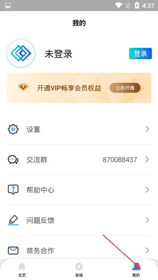 3、我的頁面呈現(xiàn)未登錄狀態(tài),登錄后可開通VIP暢享會員權益,同時設置可自定義應用參數(shù)、交流群方便用戶交流使用經(jīng)驗等,完善的功能體系提升用戶使用體驗。
