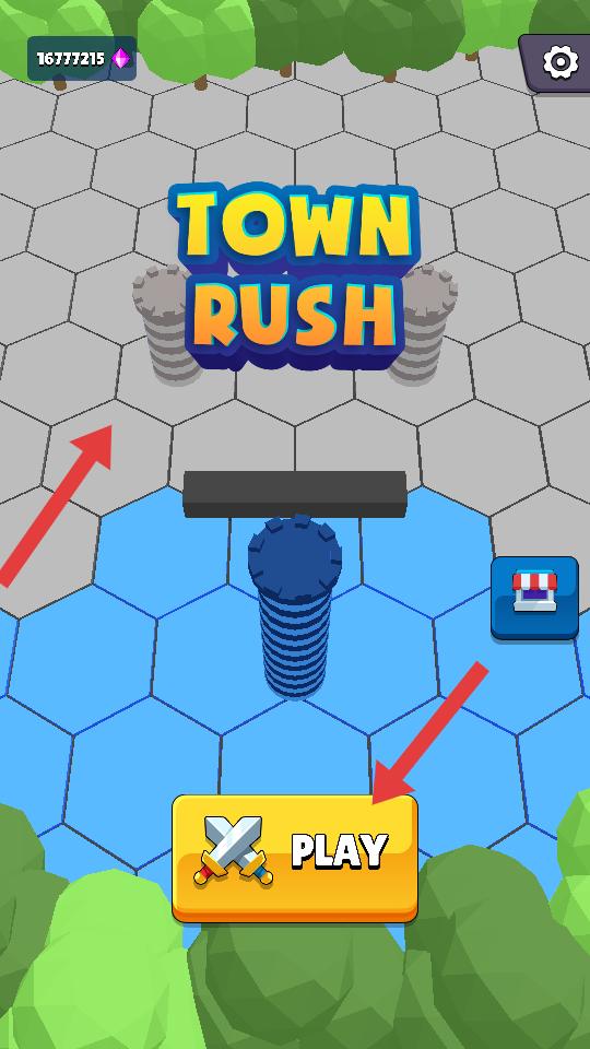 1、進(jìn)入游戲,看到帶有TOWN RUSH字樣的標(biāo)題界面,點擊PLAY按鈕,就能開啟游戲,準(zhǔn)備在六邊形的場景里展開冒險。