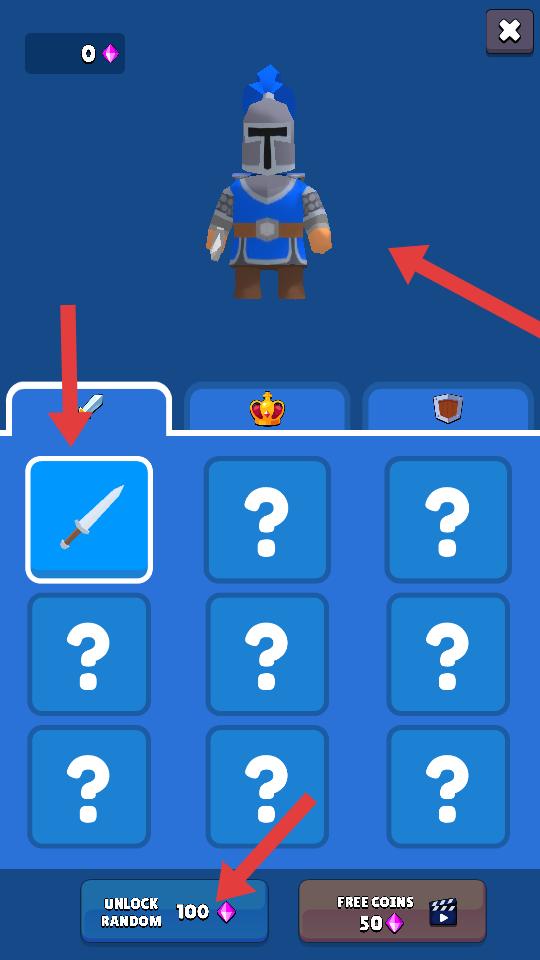 2、可以看到穿著盔甲的角色形象,下方有武器等物品欄,花費(fèi)100鉆石能解鎖隨機(jī)物品,助力角色在游戲里更好地行動。