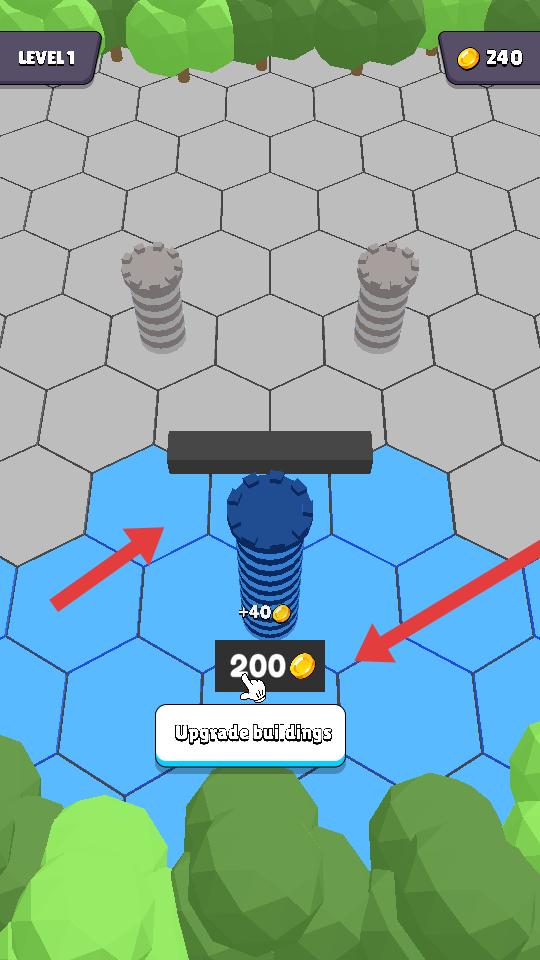 3、關(guān)卡場景中,有藍(lán)色和灰色的六邊形區(qū)域,還有塔樓,花費(fèi)200金幣可升級建筑,升級后能獲得金幣獎勵,讓建筑更強(qiáng)大。