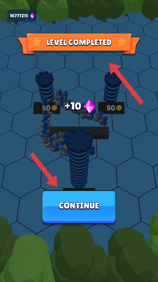 4、當(dāng)完成關(guān)卡后,會出現(xiàn)LEVEL COMPLETED的提示,還能獲得鉆石等獎勵,點擊CONTINUE按鈕,就可以繼續(xù)下一關(guān)的游戲。