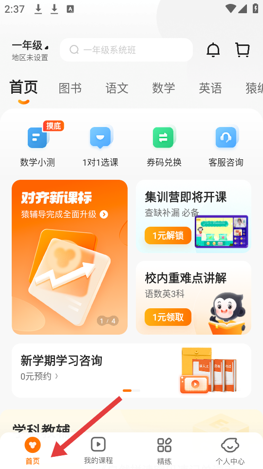 1、點擊首頁功能豐富含數(shù)學小測、1對1選課等,對齊新課標升級醒目,還有1元集訓與重難點講解課支持0元預約學習咨詢。