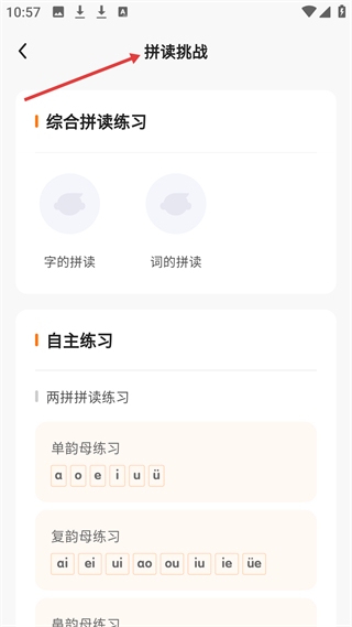 2、拼讀挑戰(zhàn)頁面,有綜合拼讀練習和自主練習,涵蓋字、詞拼讀及單韻母、復韻母等練習內容。