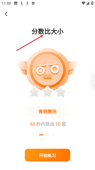 3、分數(shù)比大小練習界面,設置青銅賽場,可在60秒內挑戰(zhàn)10道題,幫助鞏固分數(shù)比大小知識。