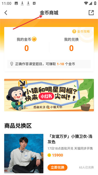 4、金幣商城頁面,顯示金幣數(shù)量與兌換情況,可通過正確作答課堂題目賺金幣,兌換友誼萬歲小猿衛(wèi)衣等商品。