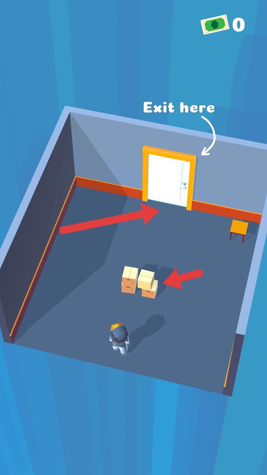 1、進入游戲,會看到有標著Exit here的門和箱子的房間,要在房間里探索,尋找能幫助逃脫的線索或物品,開啟逃脫挑戰(zhàn)。