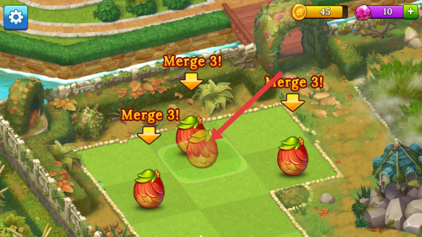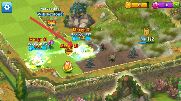 1、游戲開(kāi)始能看到帶有Merge3提示的植物,可將相同的植物進(jìn)行合并操作,合并后會(huì)有新的變化,推進(jìn)植物培育。