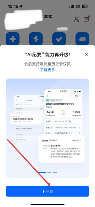 3、登錄后,會彈出AI紀要能力升級的提示,可點擊下一頁查看更多相關(guān)介紹,了解會后沉淀至歷史會議頁等功能。
