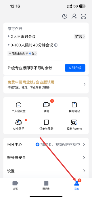 4、完成相關(guān)提示查看后,進入騰訊會議主界面,能看到可召開的會議類型、剩余加時卡等信息,還有個人會議室、錄制、AI小助手等功能入口。