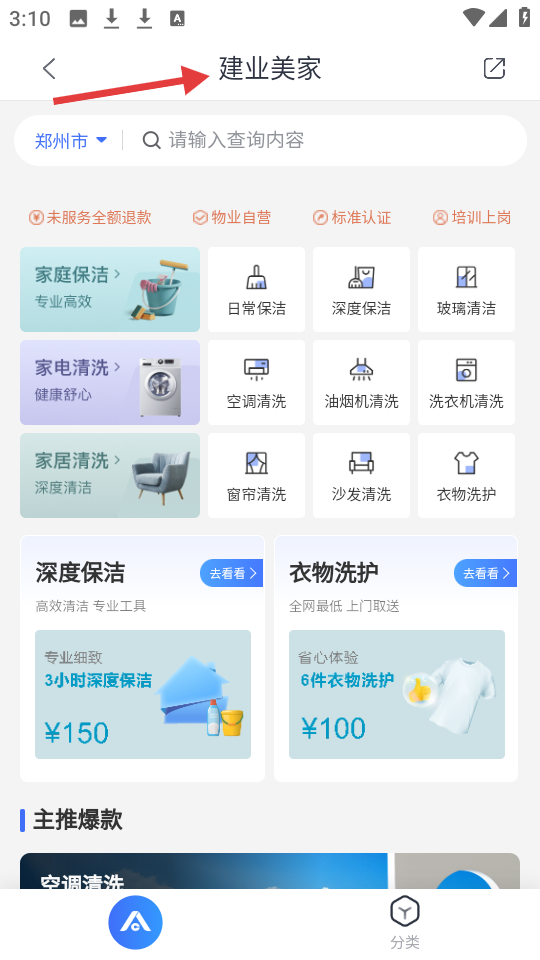 1、建業(yè)美家界面定位鄭州,聚合家庭保潔、家電清洗等家政服務,強調(diào)未服務退款等保障,展示深度保潔等主推項目。