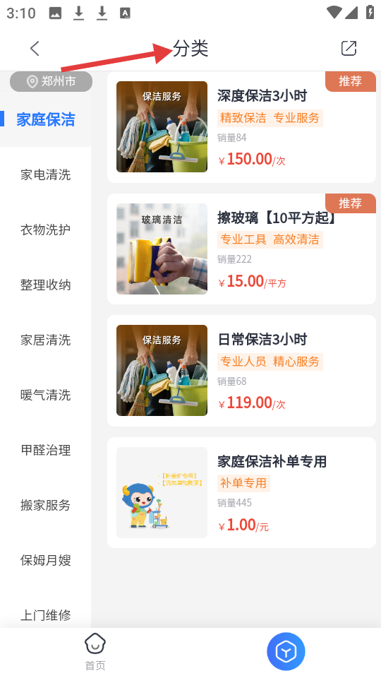 2、分類頁面涵蓋家庭保潔到保姆月嫂等多種服務,清晰列出各服務價格與銷量,如擦玻璃每平15元助用戶便捷挑選。