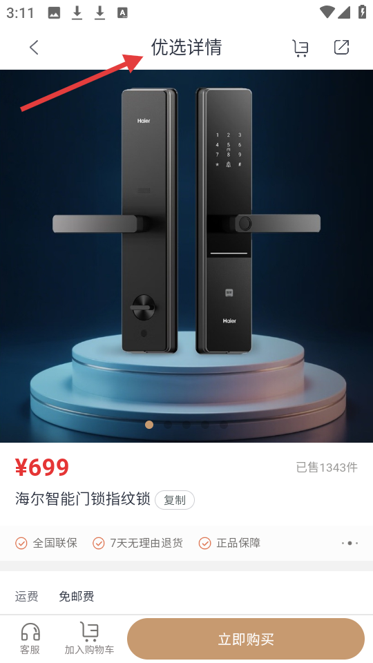 3、優(yōu)選詳情頁展示海爾智能門鎖,標注699元售價與1343件銷量,提供全國聯(lián)保等售后,支持加入購物車與立即購買。